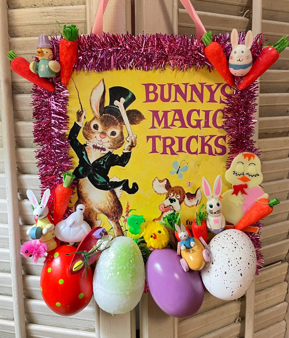 This whimsical decoration features a vintage Bunny's Magic Tricks book cover with lots of spring cheer! Your decoration measures 9 inches tall and would add a nice bit of springtime fun to your home!