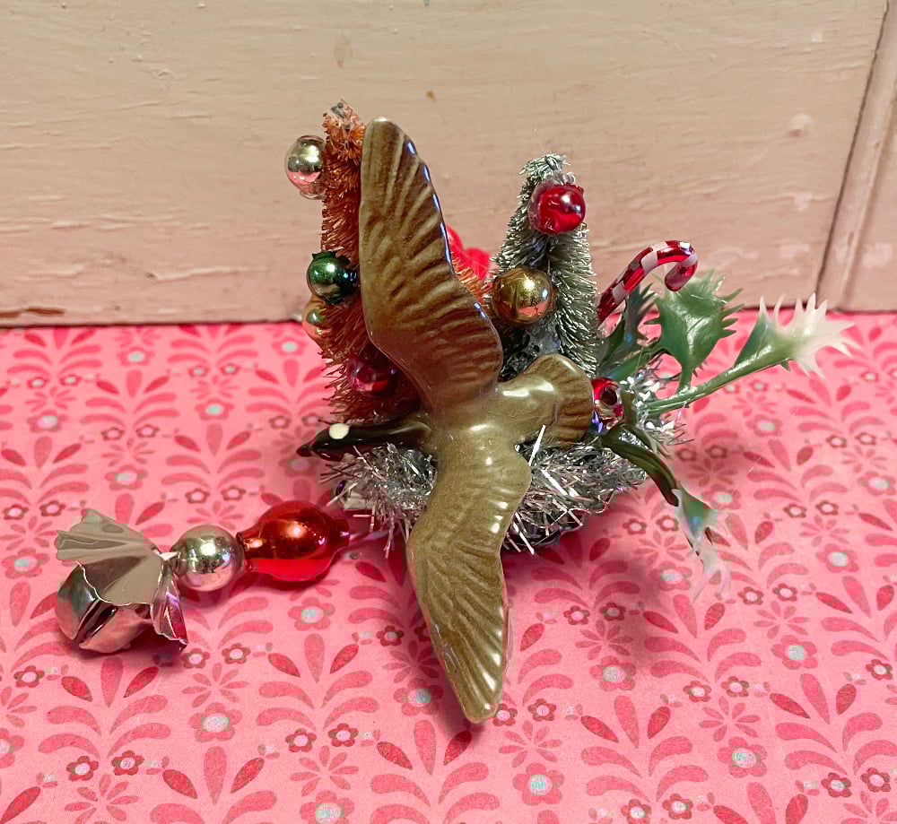 This whimsical decoration features a vintage ceramic Canada goose on a metal candle clip with vintage Christmas cheer! Your decoration measures 3 inches tall and would add a nice bit of holiday cheer to your home!