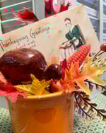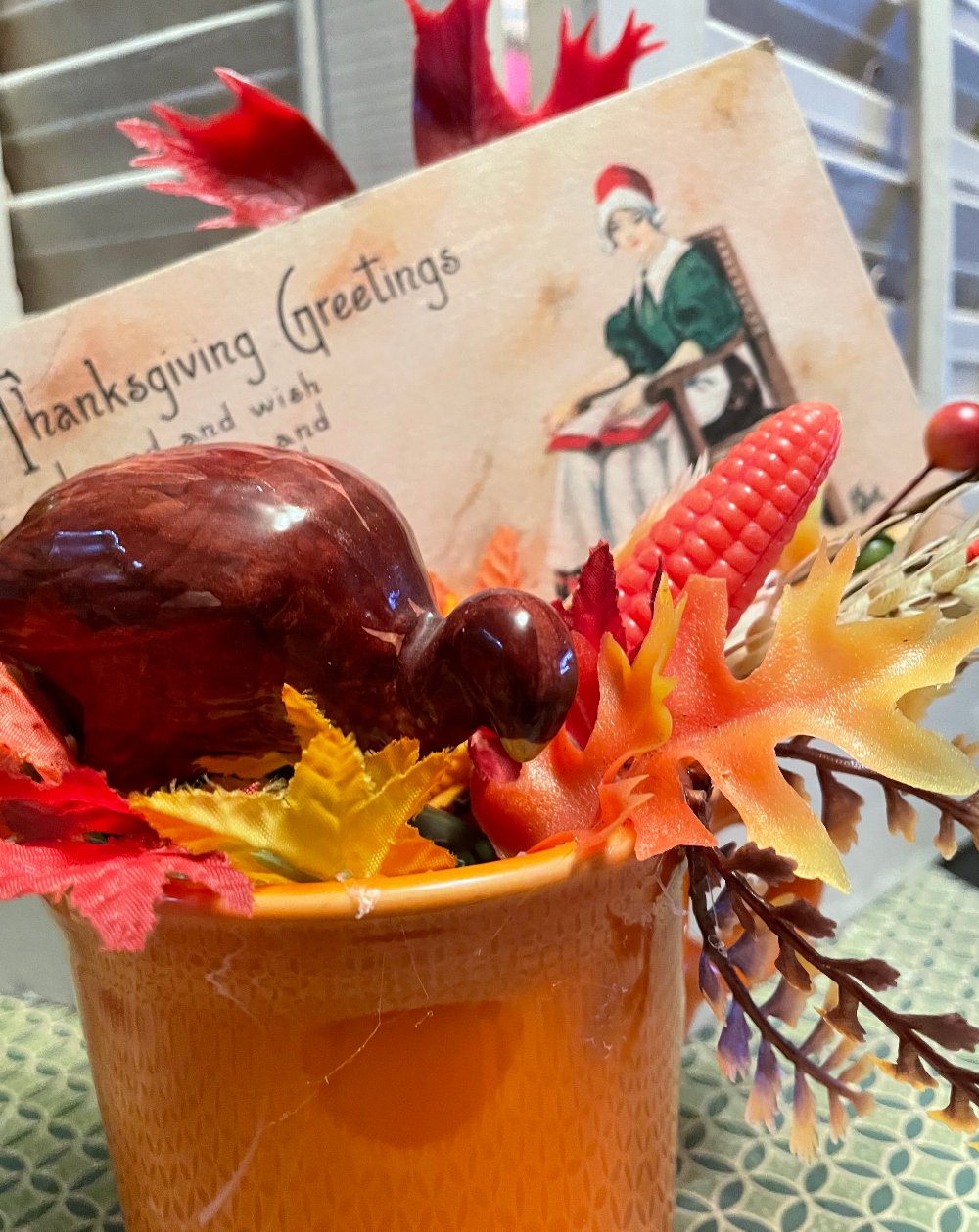 This whimsical decoration features a vintage Fiestaware mug, with a vintage turkey, antique postcard, and more harvest time cheer! Your decoration measures 7 inches tall and would add a nice bit of Thanksgiving joy to your home!