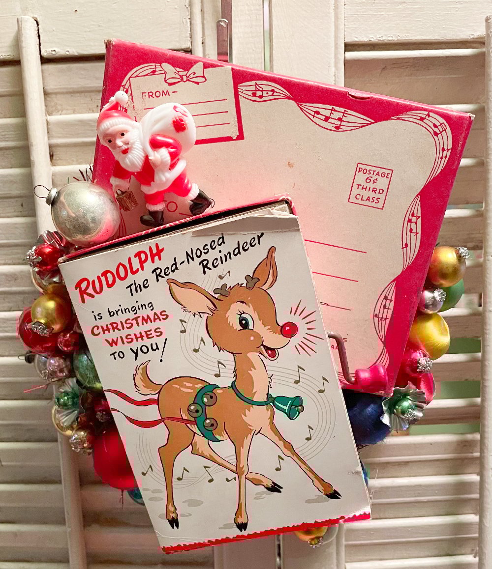 This whimsical decoration features a vintage Rudolph the Red-Nosed Reindeer card (the music box sadly no longer works) and lots more vintage Christmas cheer! Your decoration measures 10 inches tall and would add a nice bit of holiday cheer to your home!