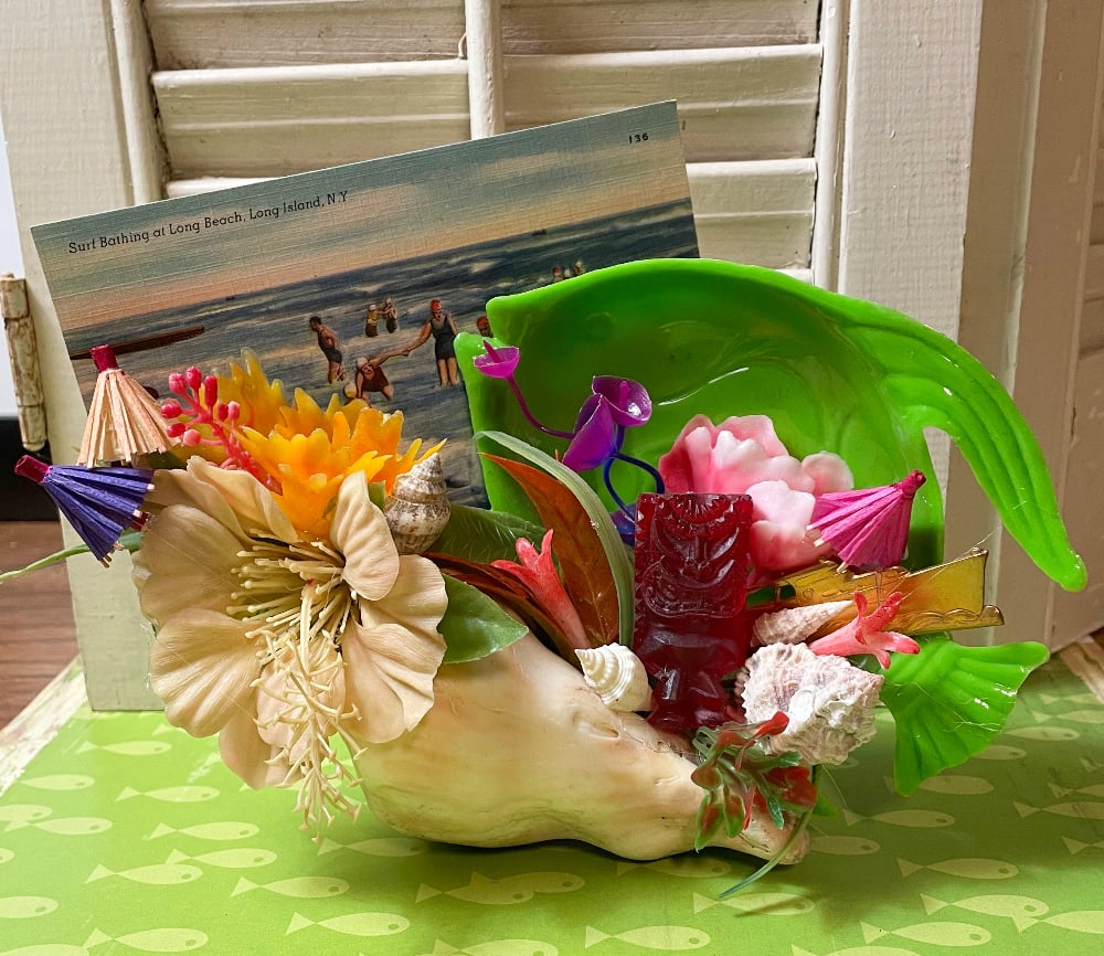 This whimsical decoration made from a whelk shell and is packed full of vintage tropical cheer! Your decoration measures 7 inches tall and would add a nice bit of seaside fun to your home!