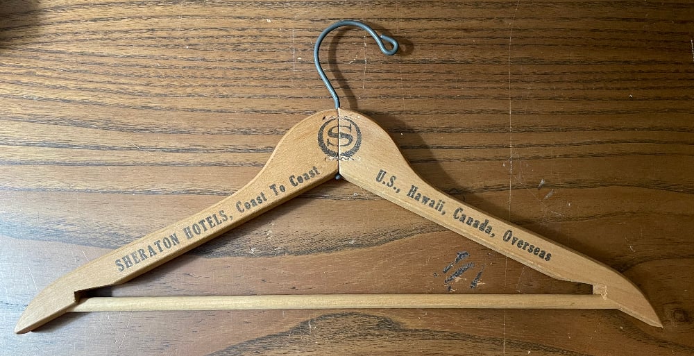 Here is a vintage Sheraton hotel wooden coat hanger.