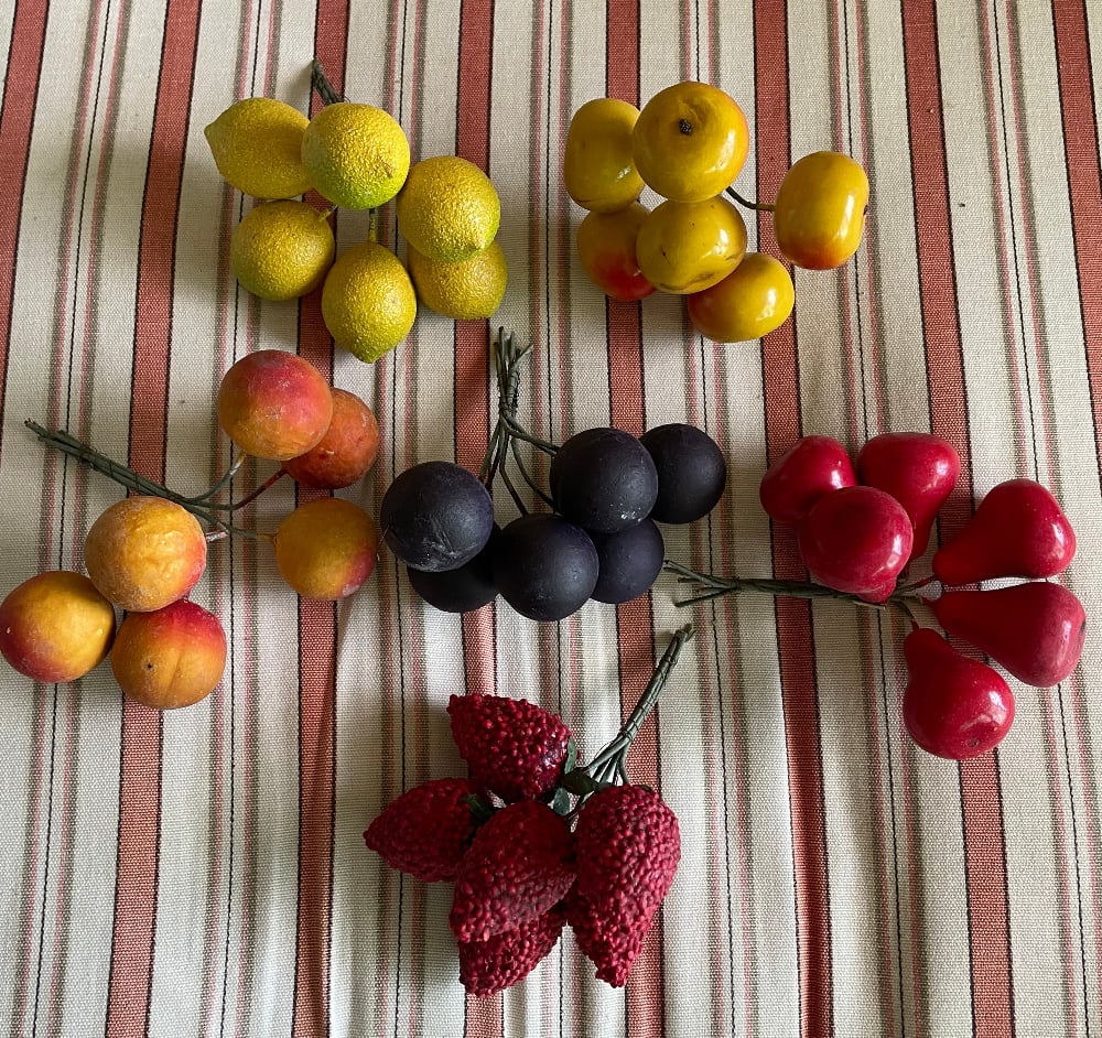 Here is a vintage lot of lacquered millinery fruit bundles! Each fruit piece is approx 1" wide.